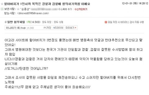 그리고 오늘 할아버지께서 연락해오셨는데 판의 글을 보셨다고 합니다. 자기가 돈을 바라고 한게 아닌데 속상하기도 하지만 자신이 말하고자 하는 바는 피해에 대한 보상보다는 다른 쪽에 있다고 하셨습니다. 보내오신 메일과 파일 캡쳐해서 올립니다