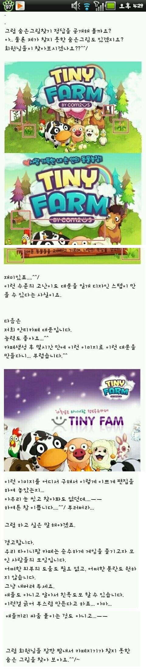 오늘은 제가 하는 SNG 타이니팜이란 게임의 카페에서 있었던 일들에 대해 싸고 갈려고 합니다.