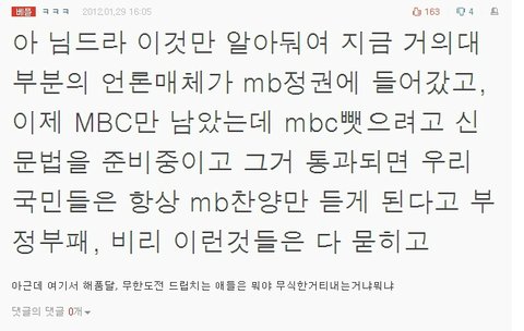 보시다시피 mbc가 버텨주지 않으면 이제 언론장악은 시간문제에요....