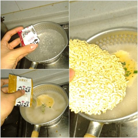 먼저, 라면 내용물을 쇼쇽 비우면