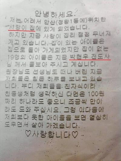 혹시 <안산의 사랑의집> 이라는 곳에서 살고있는 "박현우 전도사 외 19명"의 아이들에 대한 내용이 적힌 지하철 유인물을 나눠주는 분들을 보시거나 받으신분들 있나요?