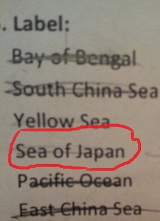 저는 오늘 사회시간에 숙제를 하나 받았습니다, 그냥 지도에 지역을 표시만 하면 돼는거였죠. 하지만 저는 그 숙제를 하는 도중 눈살이 찌푸려지는 것을 하나 발견했습니다.문제중에 "Label: Sea of Japan" 이라는 문제가 있었죠.