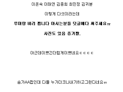 드래그 드립 조금 써두 되죰??ㅎㅎㅎ 느나들 요즘 예민하시구...완전 갇힌거같아서..좀 즐거우라고 어떤 느나 블로그에서 살짝쿵 퍼왔답니다...ㅎㅎㅎ 이렇게라두 조금 웃으시면 좋겠구..ㅎㅎ 댓글은 이글을드래그하기전상황처럼 쓰시면 좋겠습니다ㅋㅋㅋㅋ 재밌자나영 ㅋㅋㅋㅋ 알았죠??ㅋㅋㅋㅋㅋㅋㅋㅋㅋㅋㅋ