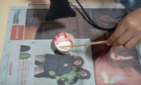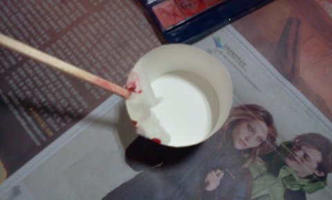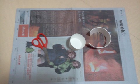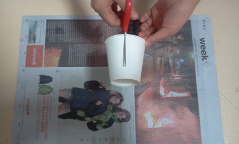 그담엔 가위로 종이컵 위쪽을 잘라줌 (글쓴이는 휘젓기 좋으려고