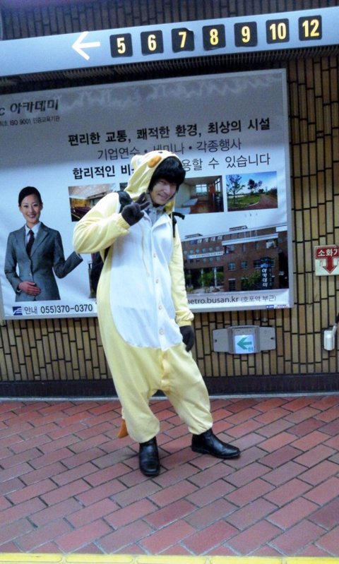 지하철을 기다리면서 피카츄 옷을 입혔소 사람들의 시선에도 자신은 절대 굴하지않고