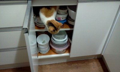 고양이 한마리가 그릇장에 있어 우리집에서 제일 이~뻐