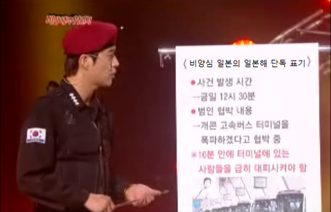 "지금 뭐 하는 겁니까! 된다 된다 해도 힘들 마당에 안 된다는 말만 늘어놓고! 이제부터는 내 지시에 따른다. 이런 일은 전부 우리가 국력이 약해서 일어난 일이다. 지금부터 각 회사마다 아이디어 회의를 해서 총 생산량과 일자리를 늘리고 국민들은 각자의 자리에서 맡은 일에 더 매진하길 바란다. 그리고 방송사는 애국을 위해 순직한 위인 스페셜 방송만 내보내고 신문사와 출판사는 동해를 위한 논평과 기사를 출간해서 매일 머릿속에 애국의 마음이 가득하게 만든다. 알겠나!"