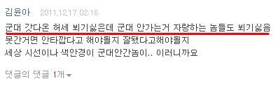 나도 여자로써는 그따위 군필자들 싫어해, 면제자보다도 고약한놈이지."