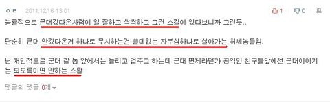 "쓸데없이 면제자 욕하고다니는주제에, 군필자 치고는, 어떤 여자들이 좋아할꺼같애?