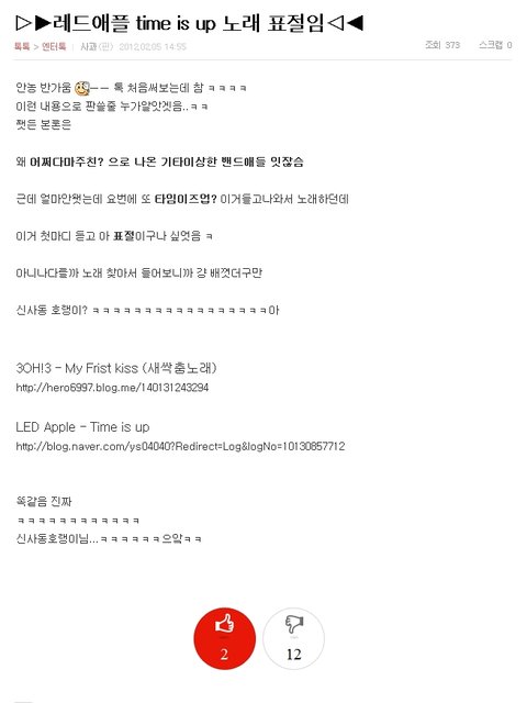 진짜 레드애플 표절 의혹이 나오는건 참을수가 없네요 레드애플은 왜 앨범이 나올때마다 표절 의혹을 받아야 되는건지요,my first kiss랑 time is up이 비슷하게 들린다고 무조건 표절이라고 우기는건 좀 아닌거 같네요 제가 LEDA라서 이런 생각하는 거일수도 잇지만 반대가 추천보다 많죠^?^ 표절이라고 생각하시는 분들은 많이 계시지 않는 다는 뜻같네요 진짜 레드애플이요 "니가뭔데" 활동할때 표절이라고 짓껄여대서 상처많이 받앗을꺼예요 저희 레다도 그렇구요 그래도 기죽지 않으려고 더 열심히 연습하고 열심히 노력했을겁니다.입장바꿔서 생각해보세요 위에 글쓰신 분이 좋아하는 가수가 좋은 노래로 컴백했는데 리듬이 조금 비슷하고 음이 비슷하다고 해서 컴백한지 얼마 안되서 표절의혹 받으면 기분 어떻겠어요 짜증날거같죠 니들이 뭔데 좋은노래 표절의혹 시키냐고 저희도 똑같아요 아니꼬우시면 직접 작사를 해보시던가요^0^ 곡을 만들다 보면 음이 비슷할수도 있고그런거죠 앞으로는 저런글 올라와서 레플,레다 기분 상하게 하는 모습 없었으면 좋겟습니다.