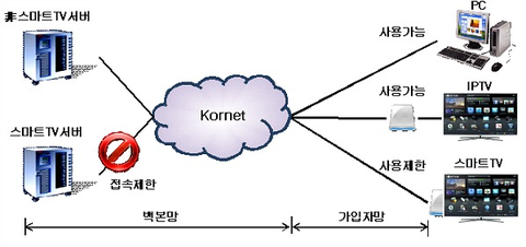 KT(회장 이석채 www.kt.com)는 다수 인터넷 이용자 보호 및 시장질서 왜곡 방지를 위해 인터넷망을 무단사용하는 스마트TV에 대한 접속제한 조치를 즉시 시행한다고 밝혔다. 접속이 제한되면 스마트TV 애플리케이션 이용이 제한되지만 이용자의 기존 방송 시청 및 초고속인터넷 사용에는 전혀 영향이 없다.
