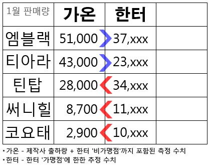 틴탑,코요태,써니힐 세팀은 오히려 출고량보다 한터가맹점 추정치 판매량이