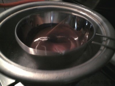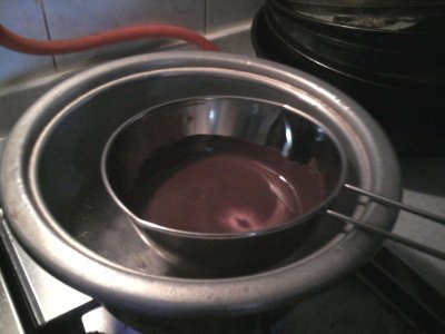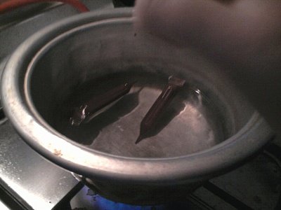 우선 중탕기보다 큰 냄비에 중탕기가 물에 뜰 정도로 넣어주고 중탕기에 초콜릿을 넣어줌 !