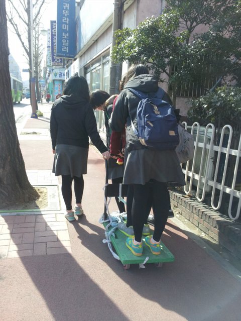우린 갈채비를 마치고 저걸 끌고감ㅋㅋ 학교에 계단이 너무많아서 운동장을통해가는 경사로를택했는데 교실에서 교문앞까지 25분이걸림ㅋ