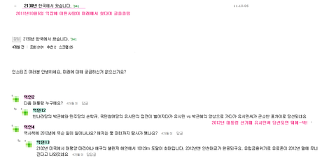 익인333- 위에도 말씀드렸지만 과거의 컴퓨터를 해킹해서 그컴퓨터 사용자의 사이트접속순위목록을 살펴보니 인스티즈가 하위였고 마침 과거의 사람들과 대화하고 싶은 제 목적과 또 그리 유명한 사이트가 아니라서 사이버수사대의 눈은 피할 수 있고 본 컴퓨터 사용자가 인스티즈 이용을 안하기 때문에 걸릴 염려가 적다는 점이 충족되어, 제가 해킹한 컴퓨터 사용자의 아이디로 몰래 들어와 있습니다.