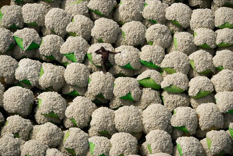 목화 곤포 위에서 휴식 중인 노동자, 토나카하, 코로고 주, 코트디부아르