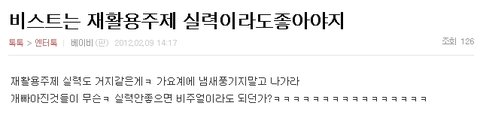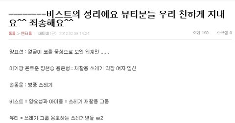 팬덤 여러분. 전 뷰티이기 때문에 이 스크랩만 올렸지만, 요즘 니엘군과 비원에이포 분들, 빅뱅 권지용 분을 욕하고 성적으로 모욕하는 글까지 올라오고 있습니다. 다른 사람의 인격 및 허황된 것을 퍼뜨리는 것은 사실이 아니던 말던 기분이 나쁩니다.
