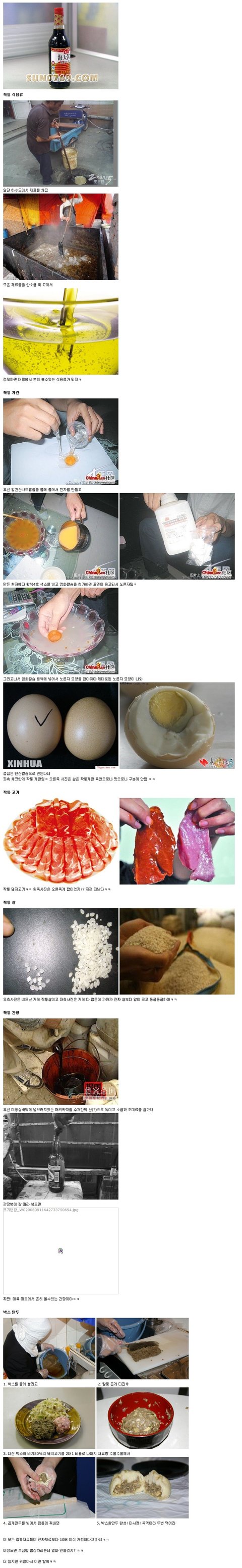 모바일배려 ----------------------------------------------------------------------- 1.짝퉁 식용류 일단 하수도에서 재료를 채집 모든 재료들을 한소끔 푹 고아서 정제하면 대륙에서 흔히 볼수있는 식용유가 되지 ㅋ 2.짝퉁계란 우선 일긴산나트륨을 물에 풀어서 흰자를 만들고 만든 흰자에다가 황색4호 색소를 넣고 염화칼슘을 첨가하면 표면이 응고해서 노른자됨ㅋ 그리고나서 염화칼슘 용액에 넣어서 노른자 모양을 잡아줘야 제대로된 노른자 모양이 나와 껍질은 탄산 칼슘으로 만든다네 좌측 체크한게 짝퉁계란임 ㅋ 오른쪽 사진은 육안으로나 맛으로나 구분이안됨 ㅋ 3.짝퉁고기 짝퉁 돼지고기 ㅋㅋ 오른쪽게 짭이겠지 ? ㅋㅋ티난다 4.짝퉁쌀 우측사진은 네모난게 가짜쌀이고 왼쪽사진은 다가짜쌀 ㅋ 가짜가 진짜보다 알이 더 크고 둥글둥글하대 5.짝퉁간장 우선 미용실에 널브러져 있는 머리카락을 수거한뒤 산(?)으로 녹이고 소금과 조미료를 첨가해 간장병에 잘 따라 넣으면 짜잔! 대륙마트에서 자주 볼수있는 간장이야 ㅋㅋ 6.박스만두 박스를 물에 다지고 칼로 잘 다진후 다진박스와 비계80%의 돼지고기를 2:1 비율로 나머지 재료랑 주물주물해서 곱게 만두를 빚어서 찜통에쪄내면 박스왕만두 완성! 마시쪙! 꼭먹어라 두번머거랑! 이 모든 짝퉁재료들이 진짜 재료보다 10배이상 저렴하다고하내 ㅋㅋ 이정도면 푸짐한 밥상 차리는데 얼마안들겠지? ㅋㅋ 더많지만 귀찮아서 이만할게 ㅋㅋ ------------------------------------------------------------ 베플감사합니다 ^.^ 쓰느라 애좀먹었어요 ㅠㅠ 엽기호러판 실시간있는 심각한 인신매매에관한 꼭읽어달라는글 제글이에요 ㅜㅜ! 꼭 읽어주세요 네이트하시는분들이 꼭 다 알아주셨으면 하는 글이니까 잘부탁합니다 !