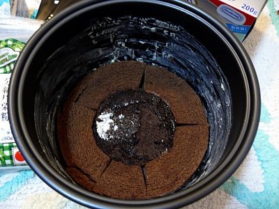 밥통에 버터나 오일을 바르고 치즈케익 밑부분이 될 시트를 넣음.