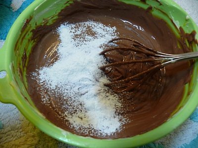 중탕한 초코까지 넣고 저어놓은 반죽에 박력분 2스푼, 전분2~3스푼을 체쳐 넣음.