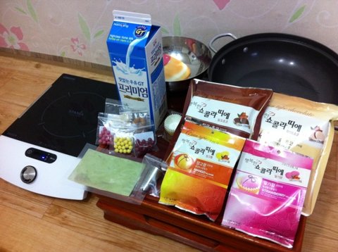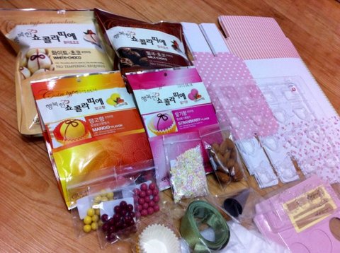 화이트초콜렛, 밀크초콜렛, 망고향과 딸기향, 초콜렛 담을 상자, 별깍지, 짤주머니, 유산지컵 등등
