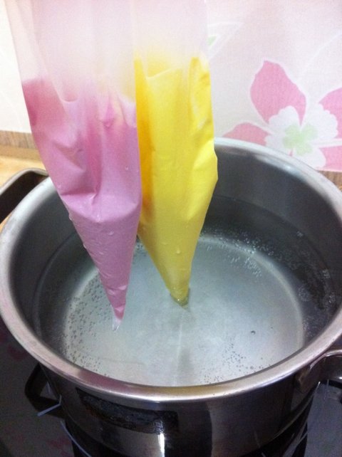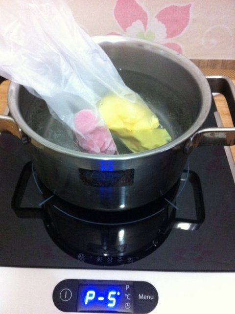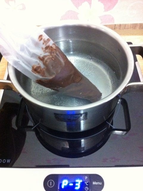 먼저 밀크초콜렛을 짤주머니에 넣고 중탕으로 녹여줍니당! 녹일때 손으로 주물주물 해야되요ㅋㅋ