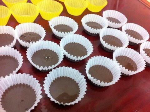 이렇게 잘 녹은 초콜릿을 준비된 유산지컵에 절반가량 넣었어요 ㅋㅋㅋ