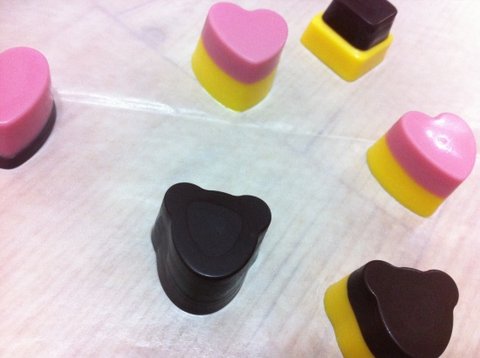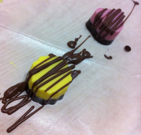 이제 딸기맛초콜릿과 망고맛초콜릿을 동시에 녹여서 준비된 유산지컵과 몰드에 짜주었어요