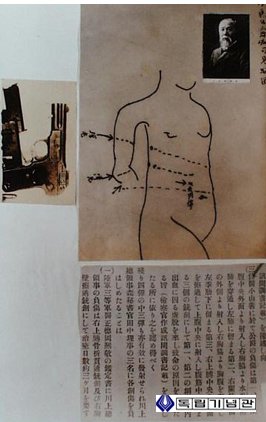 안중근 의사가 이토 히로부미를 저격할 때 사용한 총과, 이토 히로부미의 총상을 그린 인체 도해도.