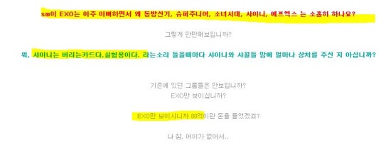 그래서 이 글의 요지는 슈퍼주니어가 대접못받았으므로 극진한 대접을 받는 EXO는 망가져야 마땅하다, 라는 것이다. 이 일과 전혀 관계없는 김영민 사장과 관련된 뜬소문을 들먹이며. EXO를 제외한 SM가수들이 돈벌이 수단이라 깎아내리며.