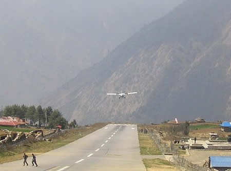 위치: 동쪽 네팔에 LUKLA라는 작은 마을에 있는 작은 공항(공항이 산 위 해발 2900 미터에 위치).