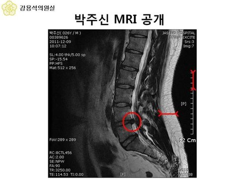 2011년 12월 9일 강남구 신사동 자생한방병원 내 자생의원에서 허리디스크 MRI 촬영, 광진구 자양동 혜민병원에서 병사용 진단서 발급.
