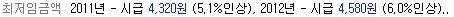 라고 다★ 이라는 포탈사이트에 적혀있음 2012년 시급이 4580원이 되었음 우린 2011년 10월부터 알바를
