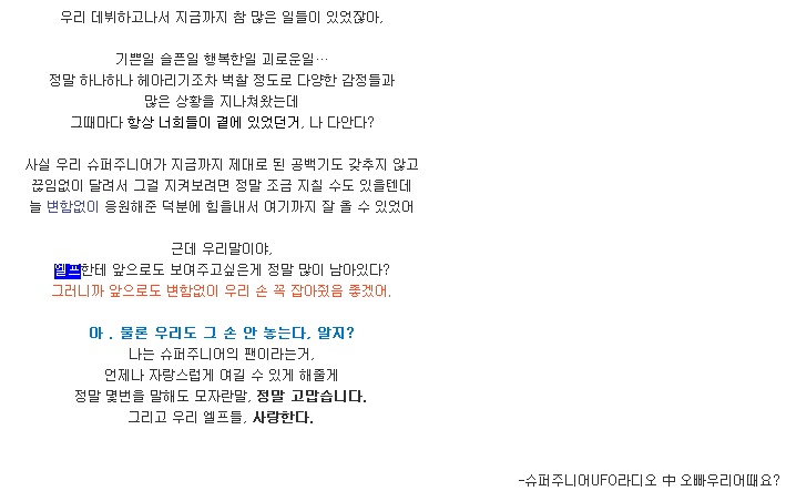 “중요한 우리 슈퍼주니어 멤버들 더욱 중요한 우리 슈퍼주니어 팬클럽 엘프.”
