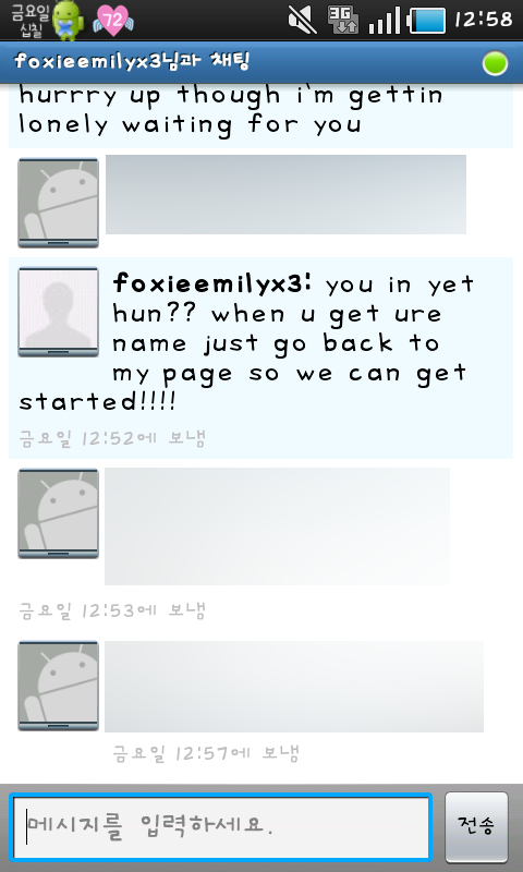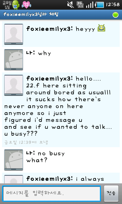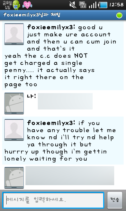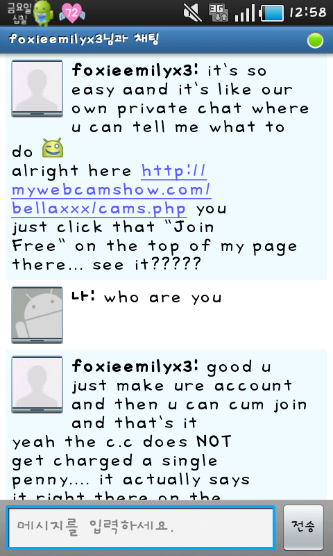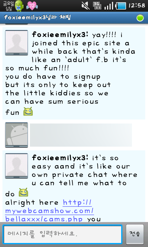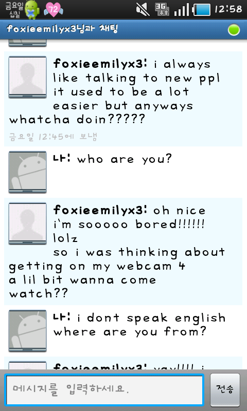 바로 오늘 한 시간 전 쯤?에 안드로이드 talk에서 이상한 사람이 대화를 걸어왔슴