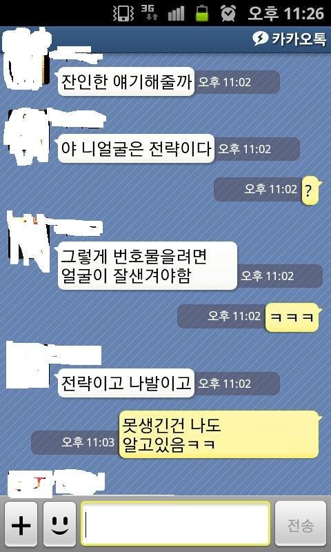 나 : 야 나 번호받으려다가 까였는데 전략을 짜야할거 같아. 조언좀 해줘 뭐 대충 이런 내용의 카톡이었습니다.