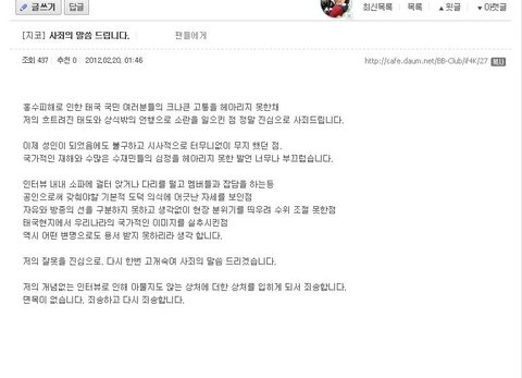 저의 흐트려진 태도와 상식밖의 언행으로 소란을 일으킨 점 정말 진심으로 사죄드립니다.