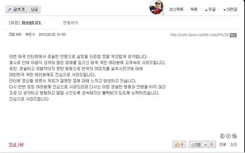 또한, 경솔하고 모범적이지 못한 행동으로 한국의 이미지를 실추시킨것에 대해