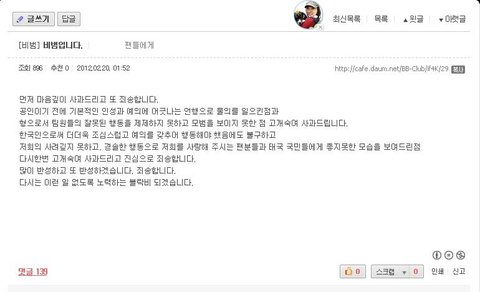 태국 국민들과 팬 여러분들께 다시한번 사죄 드립니다.