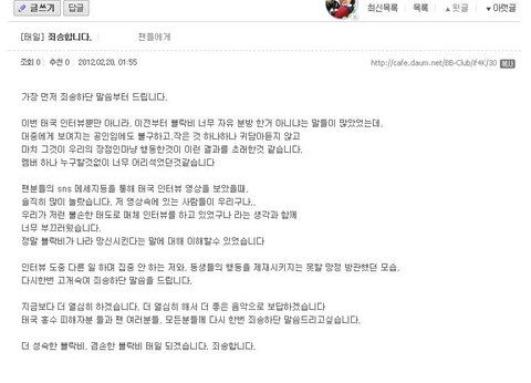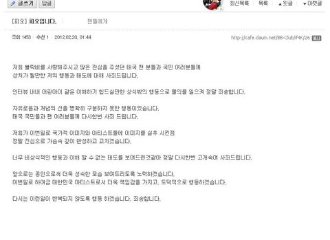이번 태국 인터뷰에서 경솔한 어행으로 실망을 드린점 정말 부끄럽게 생각합니다.
