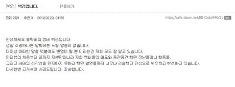 다시한번 모든 여러분께 진심으로 사과드리며 다시는 이런 경솔한 행동과 언행을 하지 않고