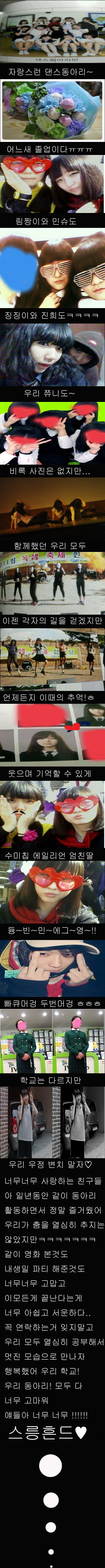 삼년동안 즐거웟어!! 비록 우리는 이학년때 만낫지많ㅎㅎ 그래도 우리 초딩때 같은반!예압ㅋㅋ