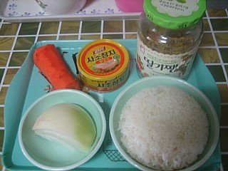 양파 당근 참치(캔) 야채뿌디 (야채를 가루로 말린것) 밥 소금