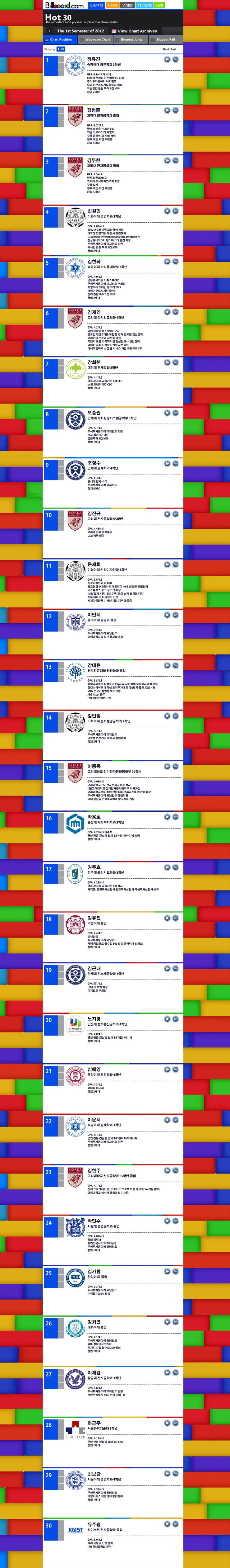 그중 대표 30명을 뽑아 빌보드차트에 오르게 되요.