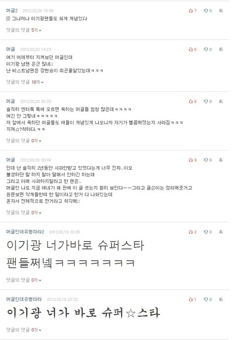 (2222222222 양요섭 용준형 쉴드는 엄청 쳐주면서 이기광만 가지고 뭐라 그럼. 난 다른 팬덤인데 이기광 너무 불쌍함... 아무런 말도 못하고 그냥 가만히 있는 거, 내가 보기에도 딱 보이는데 뷰티들은 왜 그걸 무시하고 이기광한테만 그럴까 싶음. 다들 비스트 전부 사랑한다 뭐 어쩐다 하지만 그건 다 거짓부렁가틈ㅋ 이기광 차라리 비스트 탈퇴해라. 그게 걔 정신건강에 좋은 일임.