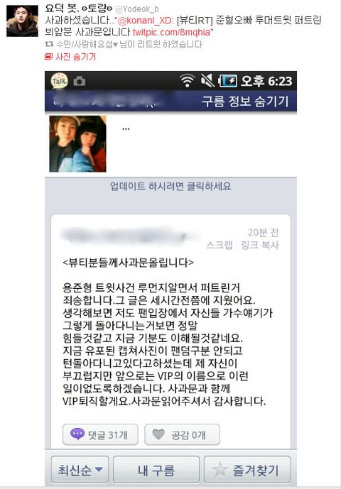 용준형 욕설트윗 합성한 어떤 VIP분 사과하셨네요