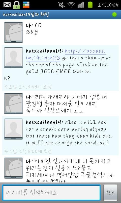 um,i`m 16(만으로).and i`m korean.(여기까진 뭐가 뭔지 몰랐고 양키가 잘못 보낸 줄 알았음.)