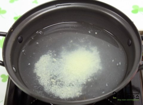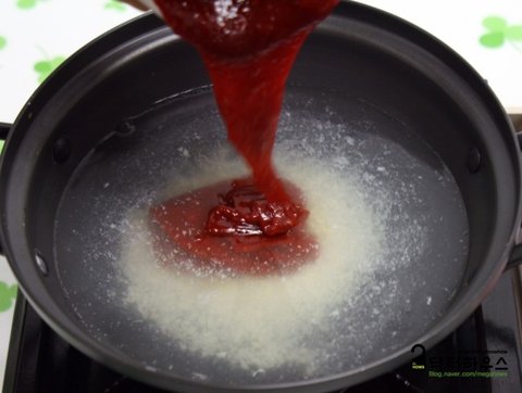 먼저 물 500ml 정도를 붓고 다진 마늘을 넣고~ 가열차게 가열하기 시작합니다. 고추장에 미리 요리당을 넣어서~ 물 속에 넣고요~ 약간 끓을 때까지 기다립니다.