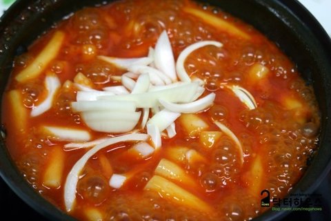앗! 이제 끓기 시작하네요~ 준비된 떡볶이떡을 투하... 저는 쌀떡 보다는 밀떡을 더 좋아해서~ 밀떡으로 준비를 했어요~ 양파와 송송 썬 파도 넣어줍니다. 그리고 매운맛을 좋아하시면 고춧가루를 적당량... 저는 매운걸 좋아해서 좀 많이~ 그리고 눌러붙지 않게 살살 저어주면... 끝 ??? 예~ 끝이네요~