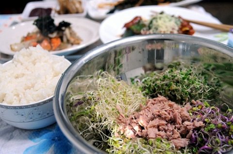 새싹비빔밥에 강된장 넣고 쓱쓱 비벼가지고